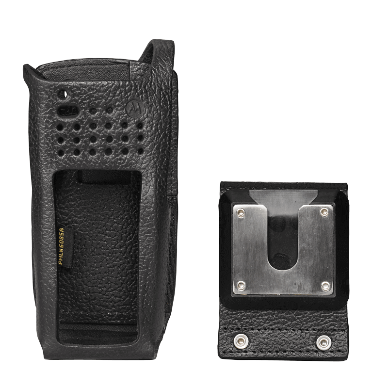 Carrying cases are available in sizes designed to fit your radio and battery and permit audio to be heard clearly. This hard leather carrying case with 2.5-inch swivel belt loop is designed for use with the APX 4000 radio. Swivel model cases secure to a belt loop and allow the case to swing freely from side to side. The swivel latch system also allows the radio and case to be removed from the belt loop by simply inverting the case and lifting it up and out of the belt loop.