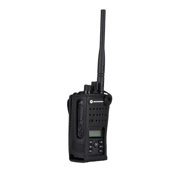 Carrying cases are available in sizes designed to fit your radio and battery and permit audio to be heard clearly. This hard leather carrying case with 2.5-inch swivel belt loop is designed for use with the XPR 3500 display radios. Swivel model cases secure to a belt loop and allow the case to swing freely from side to side. The swivel latch system also allows the radio and case to be removed from the belt loop by simply inverting the case and lifting it up and out of the belt loop.
