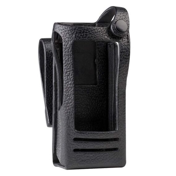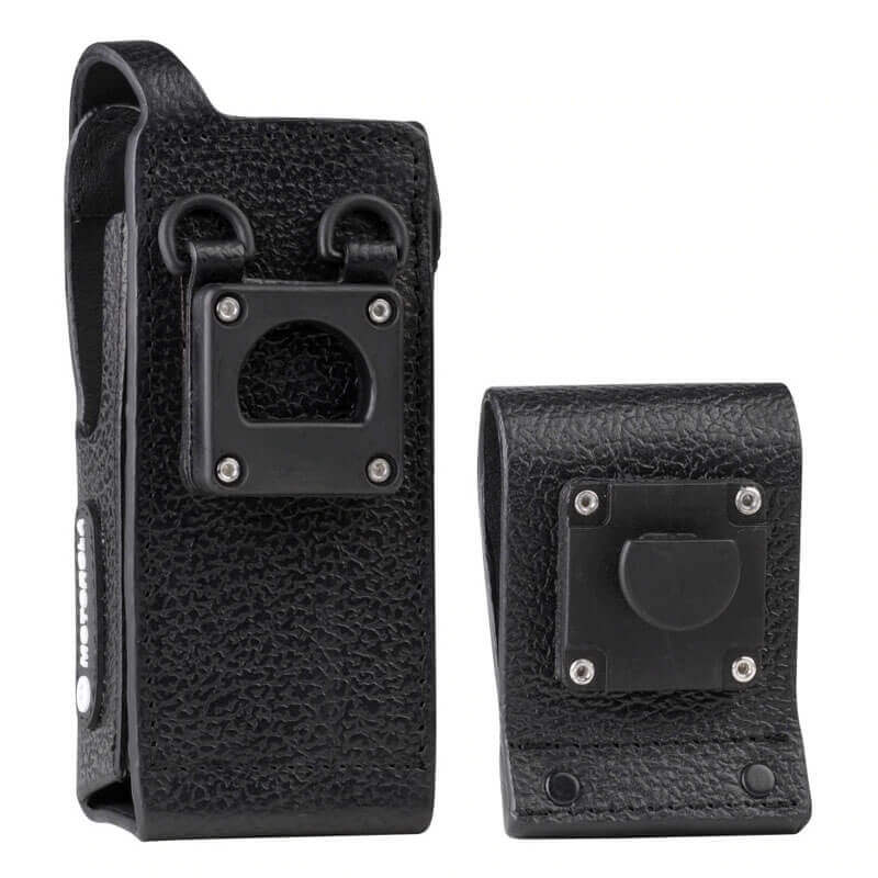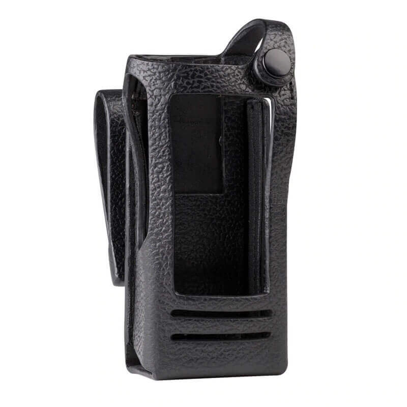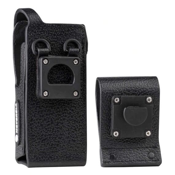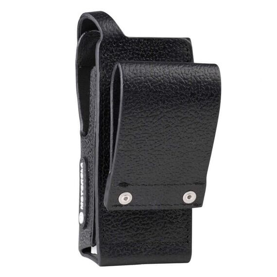 Carrying cases are available in sizes designed to fit your radio and battery and permit audio to be heard clearly. This hard leather case with 2.5-inch swivel belt loop is designed to work with the XPR 6000 series of display radios. Swivel model cases secure to a belt loop and allow the case to swing freely from side to side. The swivel latch system also allows the radio and case to be removed from the belt loop by simply inverting the case and lifting it up and out of the belt loop.