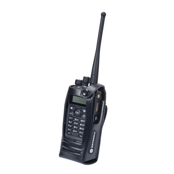 Carrying cases are available in sizes designed to fit your radio and battery and permit audio to be heard clearly. This hard leather case with 3-inch fixed belt loop is designed to work with the XPR 6000 series of display radios. Belt loop and nylon cases feature "D" rings that allow the cases to be attached to a carrying strap.