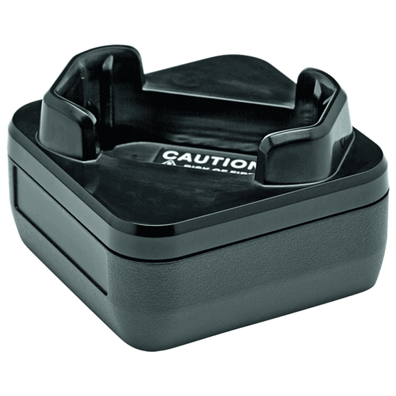 Single-unit rapid charging cradle for the EVX-S24 portable radio. The radio with battery pack fits snuggly in the charging cradle, with an LED to indicate the battery is inserted correctly.