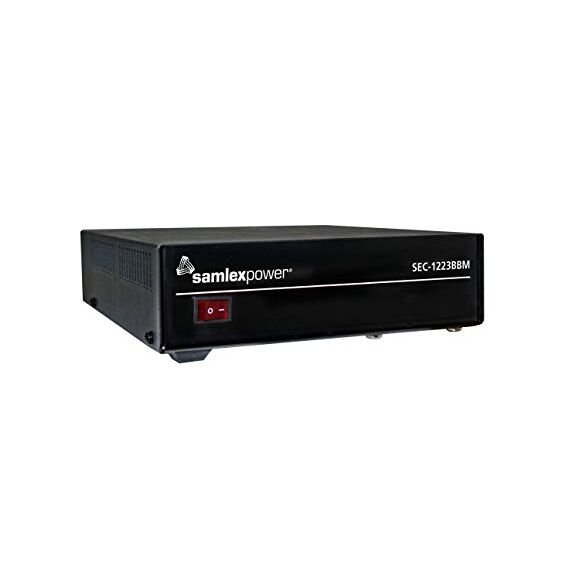 Desktop switching power supply (23A, 13.8 VDC output, 120 VAC input) with battery backup module.
