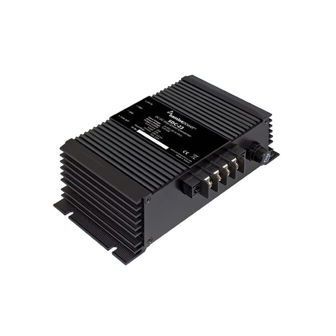 This high efficiency switch-mode step-down DC-DC converter converts an input voltage of 24 VDC nominal (range 20 VDC to 35 VDC) to a highly regulated output voltage of 12 VDC nominal (13.8 VDC) at 20 Amps. The SDC-23 DC-DC converter is non-isolated (no galvanic isolation between input and output) and meant for use in negative ground systems. Features include overvoltage/short-circuit protection, temperature compensated current limit, output-side overvoltage protection, input-side overvoltage/ transient protection and input-side reverse polarity protection.