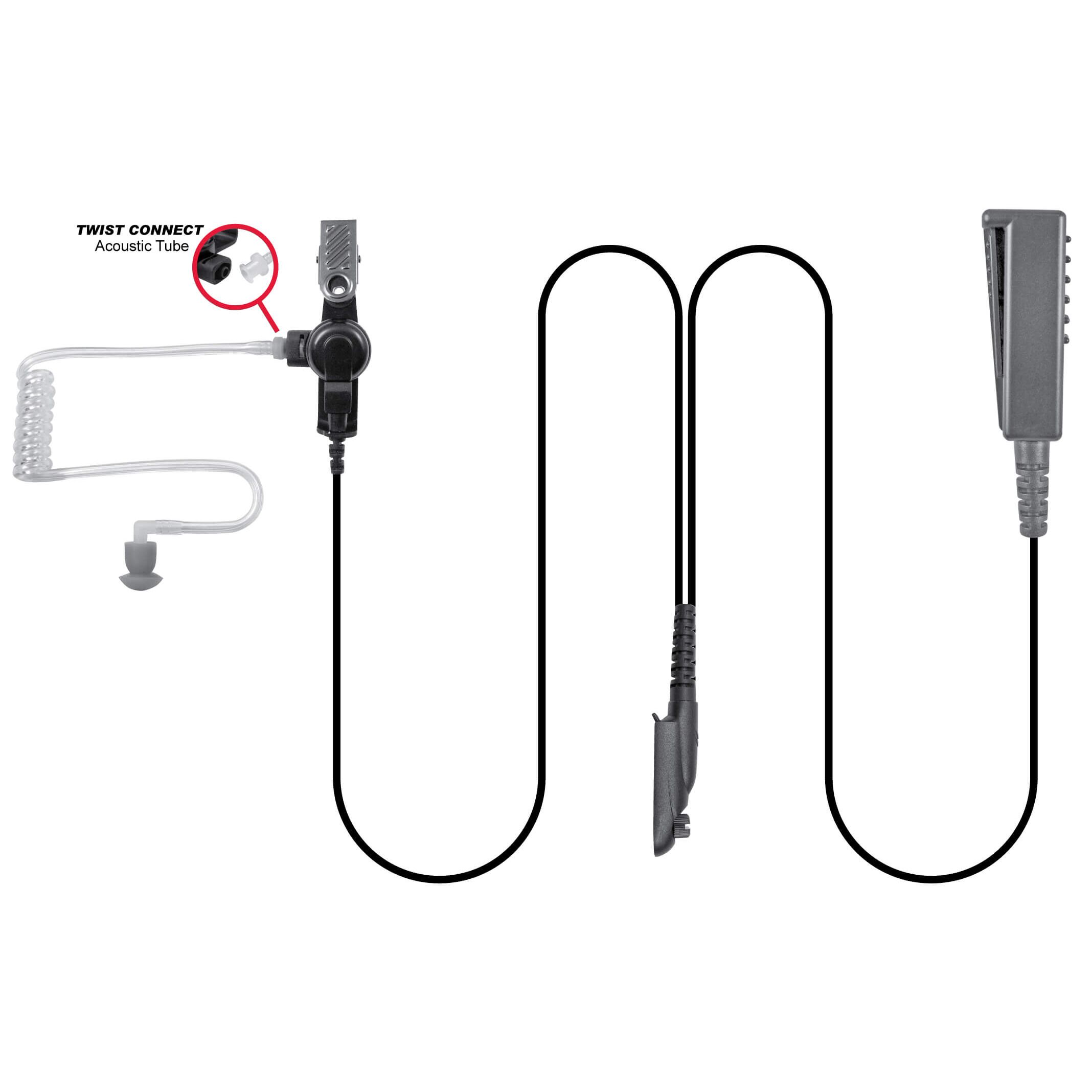 SPM-2300 Series 2-Wire Lapel Mic Kit w/Twist Connect Acoustic Tube Earphone. 2-wire Kits allow separation of the PTT/Mic unit for more convenient use. The SPM-2300 Kit Includes Bud and Semi-custom Ear Mold.