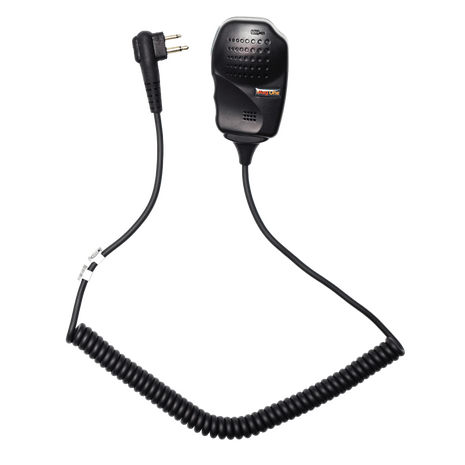 The Remote Speaker Microphone is a water-resistant compact unit that allows talking and listening without removing the radio from the belt or case. It has a coiled cord, Push-to-Talk switch. Clothing clip on microphone back clips securely onto shirt or collar.